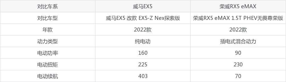 以热销车型进行对比,威马EX5搭载一台永磁/同步电机,荣威RX5 eMAX采用了一套由1.5T L4 169马力涡轮增压+电机组成的混合动力系统。