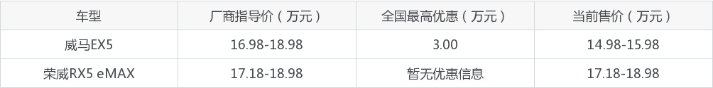 经销商价格监测数据表明,目前威马EX5部分车款最高可享受现金优惠3.00万元,荣威RX5 eMAX暂无优惠。威马EX5在全国经销商报价为14.98-15.98万元,荣威RX5 eMAX全国经销商报价为17.18-18.98万元。