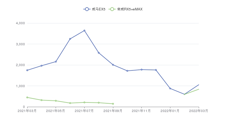 从最新发布的2022年03月份终端的销量来看,威马EX5的销量为1055辆,同比下降39.58%;荣威RX5 eMAX的销量为839辆,同比增长87.7%。对比之下,威马EX5要比荣威RX5 eMAX多售出216辆。