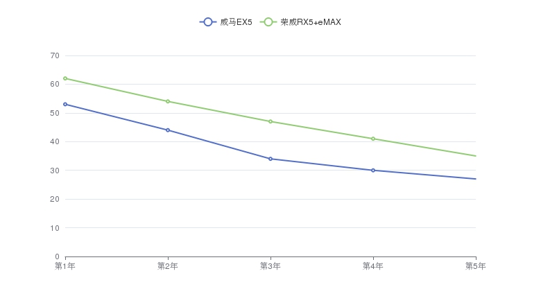 保值率方面,威马EX5年均保值率为38%,同级别排名第217,荣威RX5 eMAX年均保值率为48%,同级别排名第202。