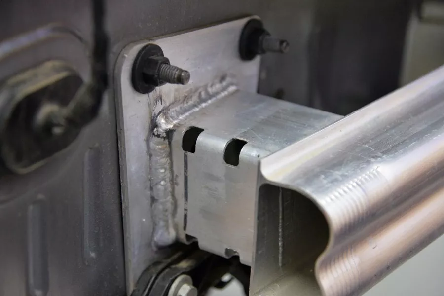 后防撞梁有独立可拆卸的铝合金吸能盒,并且带有溃缩打孔,4颗安装螺栓一个不少。