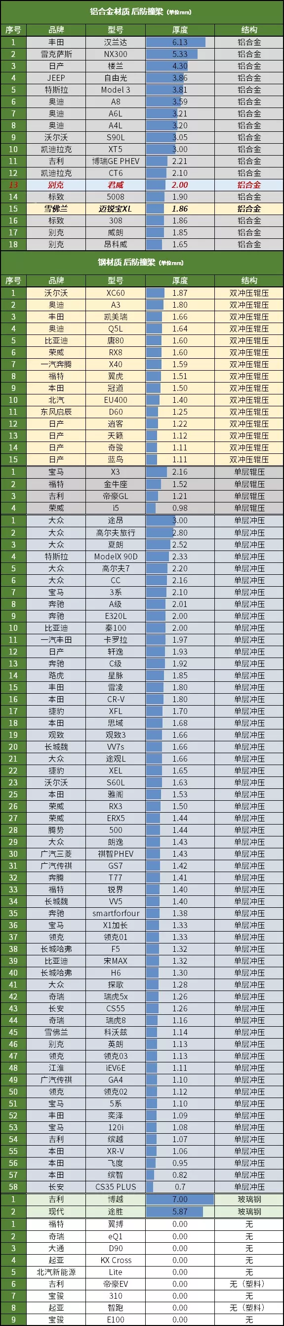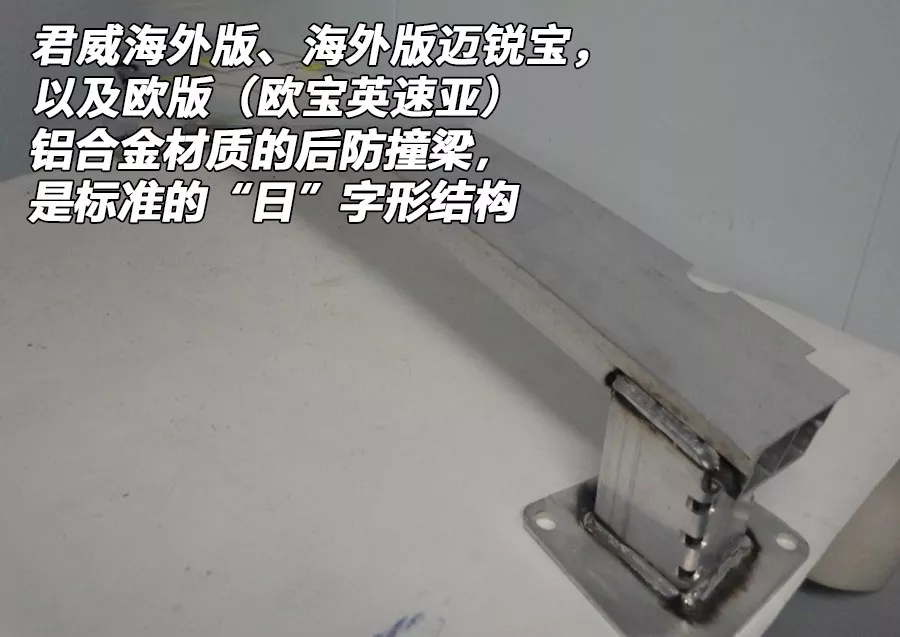 而君威海外版、欧洲版车型(欧宝英速亚)和海外版迈锐宝的后防撞梁,则是带有中央连接的“日”字形结构,在相同的材质和厚度下,比国内的“空心版”强度要高。
