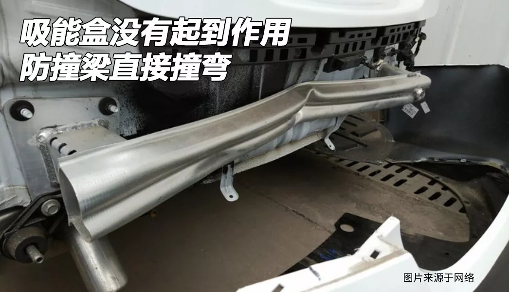 这根防撞梁虽然是铝合金防撞梁,但由于中央是空腔结构,没有结构支撑,因此强度并不高,发生碰撞后,会先行弯曲变形,吸能盒并没有溃缩吸能。