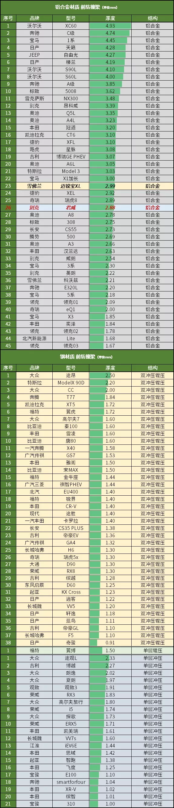 拆掉前保险杠,与老君威一样是一根铝合金前防撞梁,厚度为2.88毫米。宽度只能覆盖到62.57%的范围,但左右两侧各有一个加强梁,对25%偏斜碰撞有一定的帮助,由于它的位置和宽度比较合理,所以不光能提升碰撞成绩,在实际碰撞中也能大概率的保护到悬架及侧面部分,比某些车的纯应试要强得多。