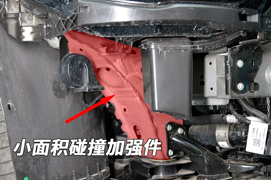 保险杠与防撞梁之间有一根行人保护泡沫,并且带有气压式传感器,也就是说这辆车具有前引擎盖主动弹起功能。