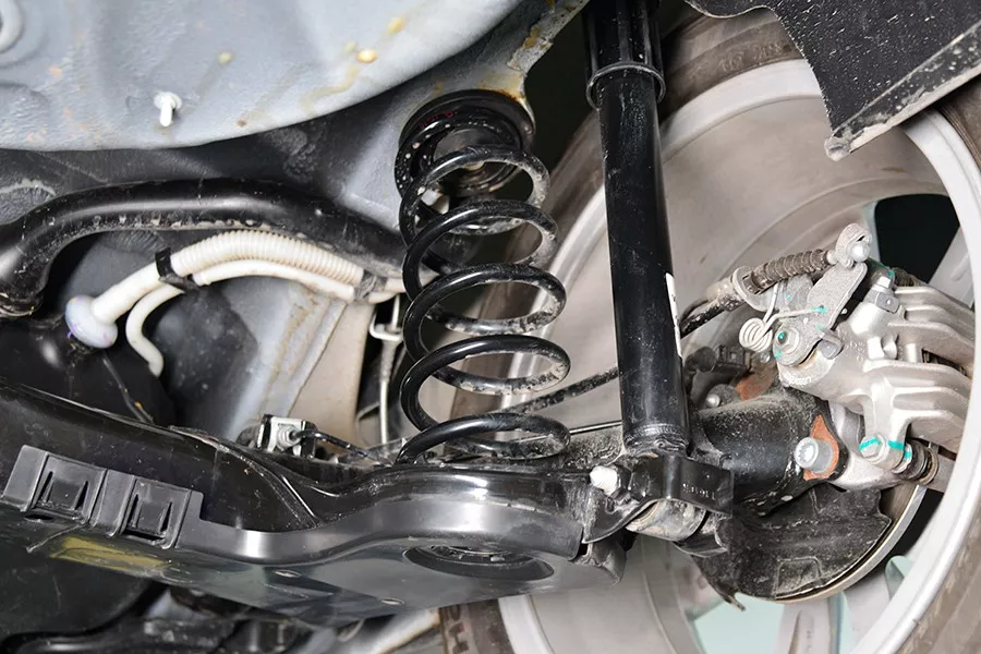 扭力梁上铺满了塑料扰流板,看上去不会显得那么单薄,当然也能起到一定的扰流作用。
