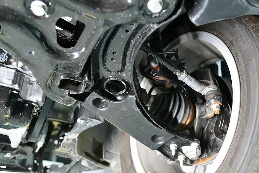 后悬架是传统的扭力梁结构,而且是最简单的焊接开口结构,和日产类似,远不如丰田、雪铁龙的那种热压一体成型闭口结构。
