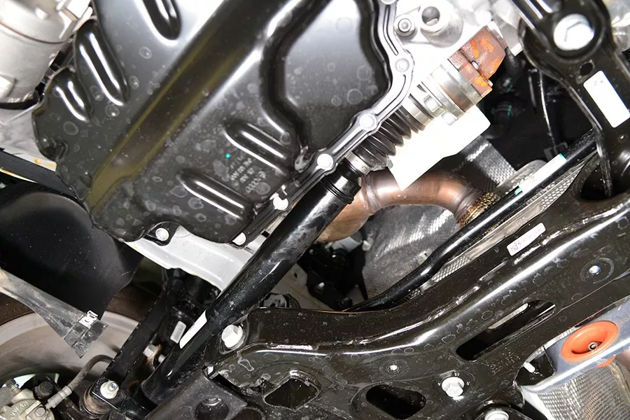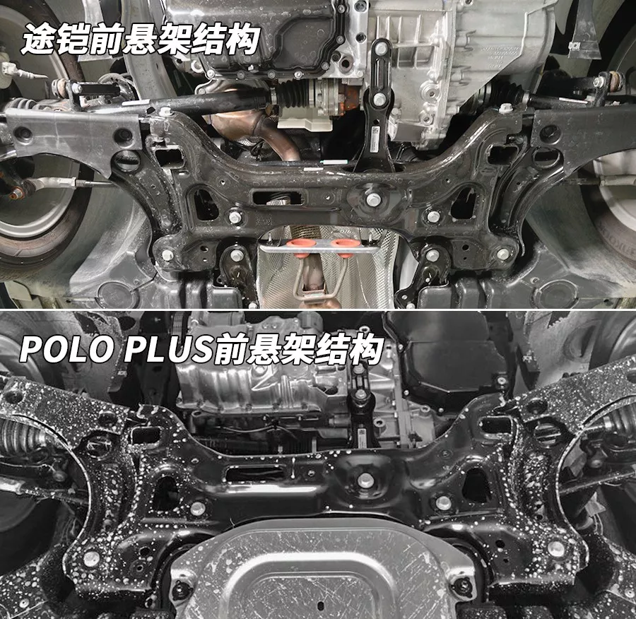 从这辆大众途铠的底盘看,结构设计方面,依旧保留了大众车一贯平整的底盘风格。虽然也是MQB平台的产物,但与我们之前拆过的那些MQB平台车型不同,途铠是MQB A0级平台打造的车型,与同平台的最新第六代POLO、也就是国内的POLO PLUS相同。