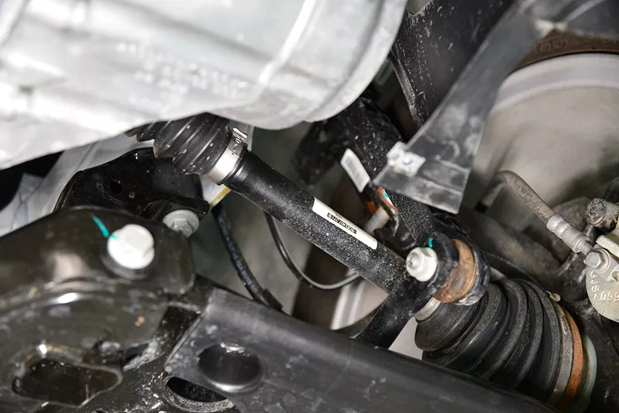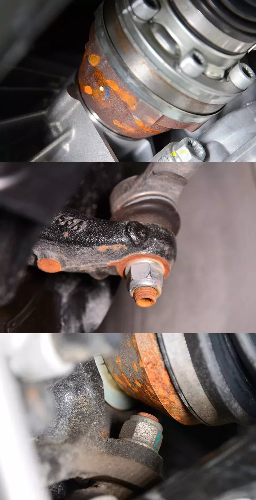 这辆车刚买不久,还未上牌,只跑了几百公里,驱动轴、转向拉杆螺栓,以及固定螺栓都出现了生锈现象。