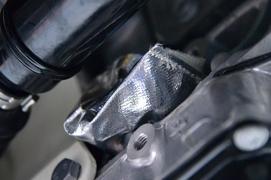油路管线被隐藏在两侧护板内,排气管隔热也做得非常到位,从前到后很完整。