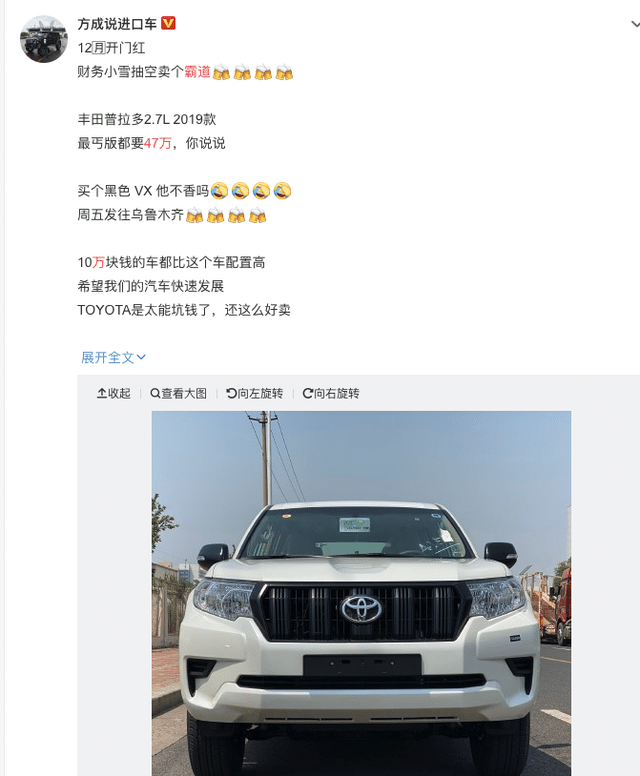 近日,在网上有一件趣事,是一家进口车商,卖掉了一款2019款,2.7L的丰田普拉多,丐版。价格是47万,买家在乌鲁木齐。卖家发了一个微博,调侃到10万元的自主品牌汽车,都比这个车配置高,希望我们的汽车能快速发展。丰田太坑人了,配置低,价格高,居然还能卖这么好,简直不可理解。