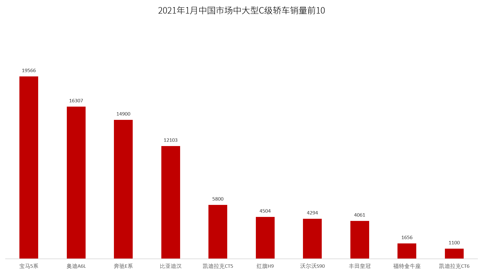 回顾整个2020年,中大型C级轿车销量排行榜前10名的车型中,仅有三款中国品牌车型(比亚迪汉/红旗H9/红旗H7)。2020年7月,比亚迪汉横空出世,上市后持续热销,最近3个月销量连续过万,除了比亚迪汉,两款红旗车型全年共销售20578辆,远远落后于比亚迪汉7-12月六个月销售40556辆的成绩。比亚迪汉的出现,填补了中国品牌在中大型C级轿车市场热销车型的空白。