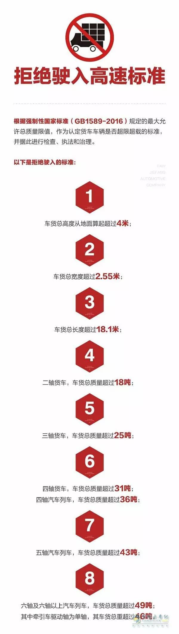 从上表格可知,中国对各类的货车、运输车的型号,其车长、车高、吨位均有不同的规定和限定标准,车辆行驶上高速必须要符合国家法定标准。