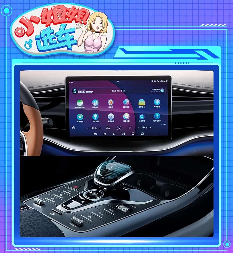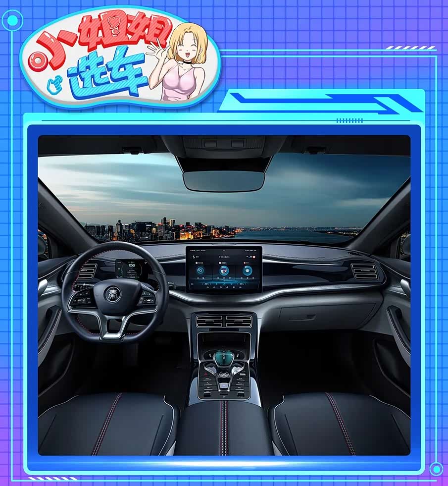 秦PLUS内饰采用了此前已经在汉、2021款唐、宋PLUS等车型上出现过的最新设计语言,与秦Pro上的那套内饰相比,秦PLUS加入了更多的曲线设计,环抱式驾舱、悬浮式大尺寸中控屏配合三辐式平底多功能方向盘,能很好地提升车内质感。电子挡杆后方的BYD-Heart控制区域造型前卫,还布置了一键启动、电子驻车、车道保持、自动空调等实体按键。