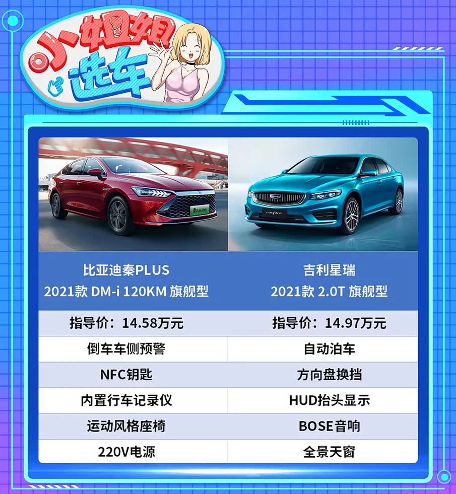 在性价比方面,我们分别选取两款车型的顶配车型:秦PLUS 2021款 DM-i 120KM 旗舰型(补贴后售价14.58万元)和星瑞2021款 2.0T 旗舰型(指导价14.97万元)来做横向对比。