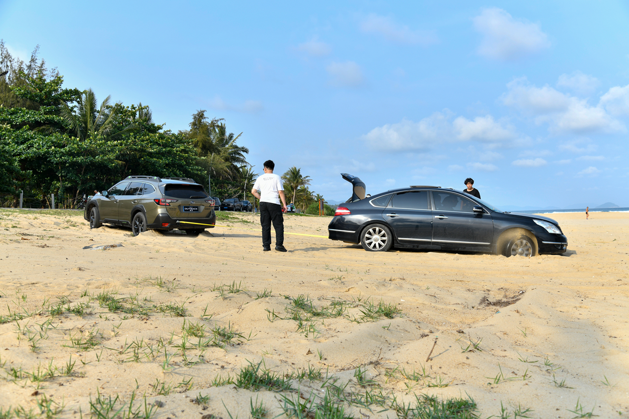 试驾临近尾声还出现小插曲,一台两驱轿车看到我们开到沙滩场地也跟了过来,结果瞬间就“杯具”了,车轮深陷沙地无法自拔。当然,我们也顺势献出了爱心,用拖车钩帮了一下这位勇敢的小伙伴。在这里也提示各位车主,如果不是四驱车型,千万别尝试开进松软的沙地。