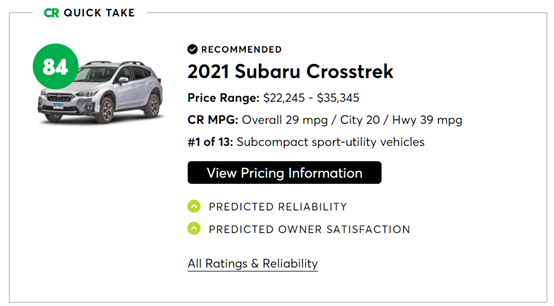 斯巴鲁Crosstrek,国内版本为斯巴鲁XV。它具有出色的燃油经济性,令人印象深刻的乘坐舒适性和令人愉悦的操控感。2.0升四缸发动机与CVT自动变速箱结合, 实际油耗为8.1L/100km。