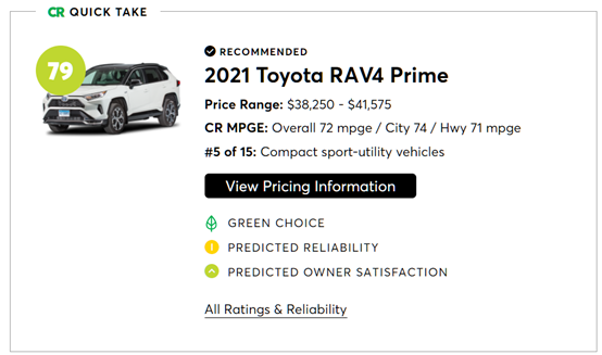 Prime版的RAV4是一款敏捷、安静、舒适的SUV。它采用了电机和2.5升四缸发动机的混动方式,最大功率222kW,堪称动力充沛。在多数情况下,电机的介入使发动机维持在较低转速,因此噪声较小。
