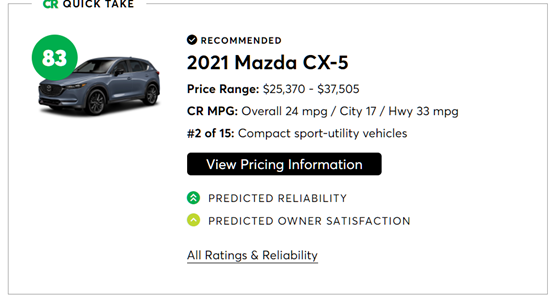 它的2.5L四缸发动机和6AT配合默契,百公里实际油耗为9.8L。CR的编辑认为它操控顺手、反应灵敏、内饰舒适、配置丰富,整体而言很合美国消费者胃口。