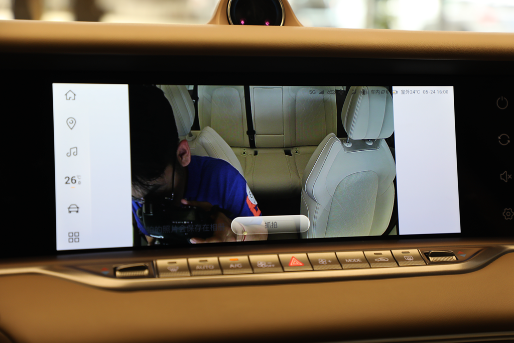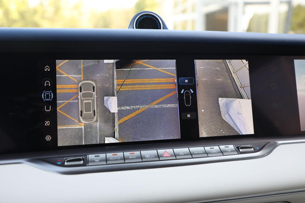 中控触摸屏内置了华为HiCar系统(类似于苹果CarPlay),可以实现华为手机与车机之间的互联。中控触摸屏内还拥有后排检测功能和透明底盘的功能。首先,后排检测功能依赖前排头顶处的摄像头,它不光可以实现车内人员的状态抓拍,而且可以实时远程查看车内状态以及实现后排生命体征监测的功能,对于宝爸宝妈十分重要,千万不要把宝宝遗留在车内。
