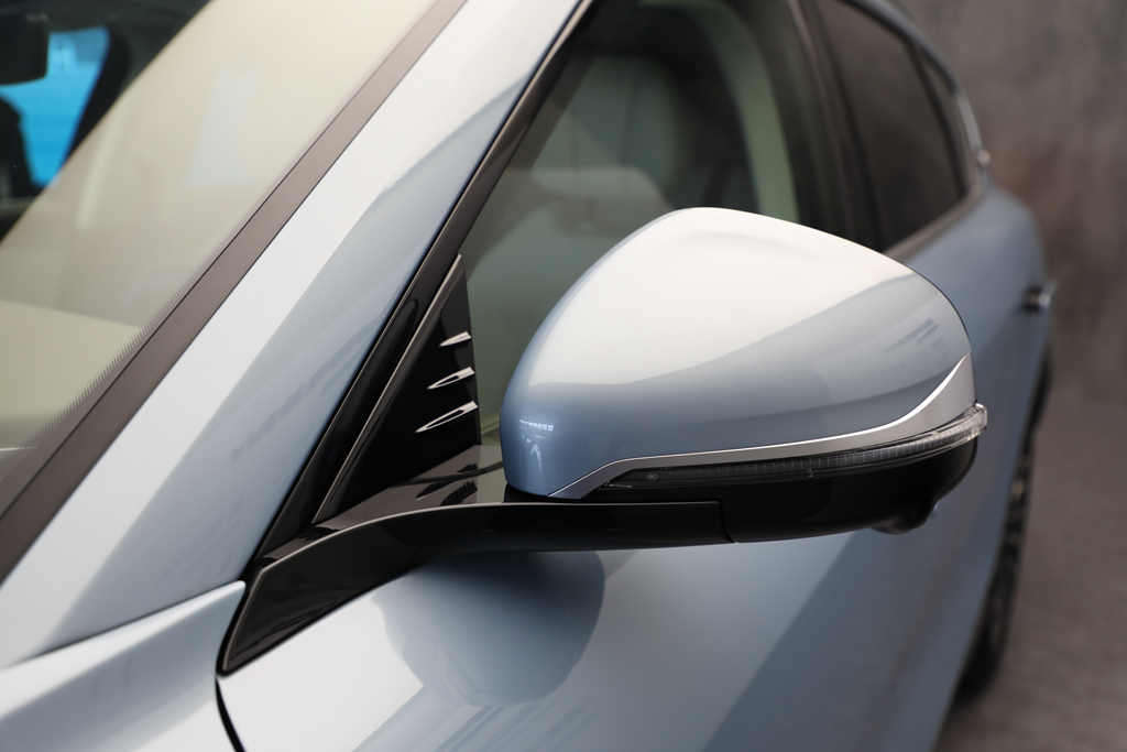 外后视镜设置在A柱上,夹角处不难看出细节设计,三条装饰线模拟出空气流动的效果,很讨巧。岚图FREE的整车造型带来了0.28cd的低风阻系数,超越了同价位的标杆车型。前排的双层夹胶的玻璃搭配超低的风阻系数,整车的隔音性十分不错。
