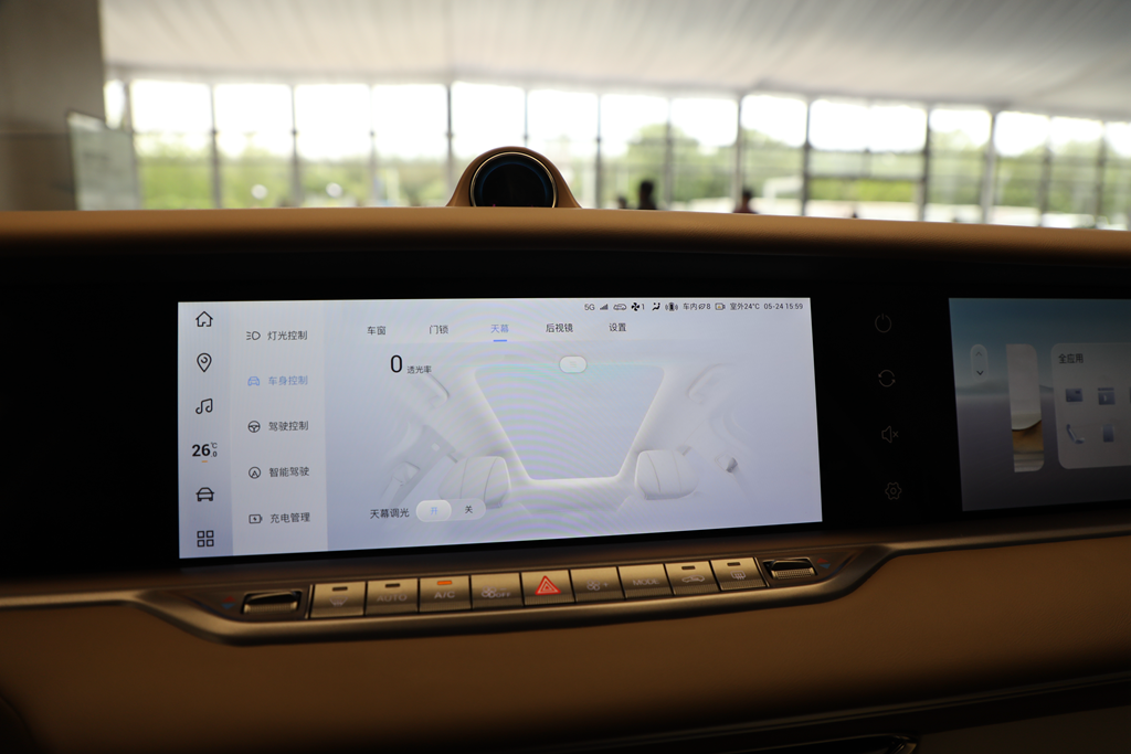 最后,我抱着猎奇的心态试了一下可调透光率的全景天窗,其原理与波音787舷窗技术相同。它拥有10级可调,紫外线隔绝率大于99.9%,隔热率大于78%。不光可以通过中控触摸屏来调节,还可以通过语音控制透光率。不过,噱头大于实用性,我相信绝大多数消费者在新鲜劲儿过了以后,就会把透光率调成0为常态。