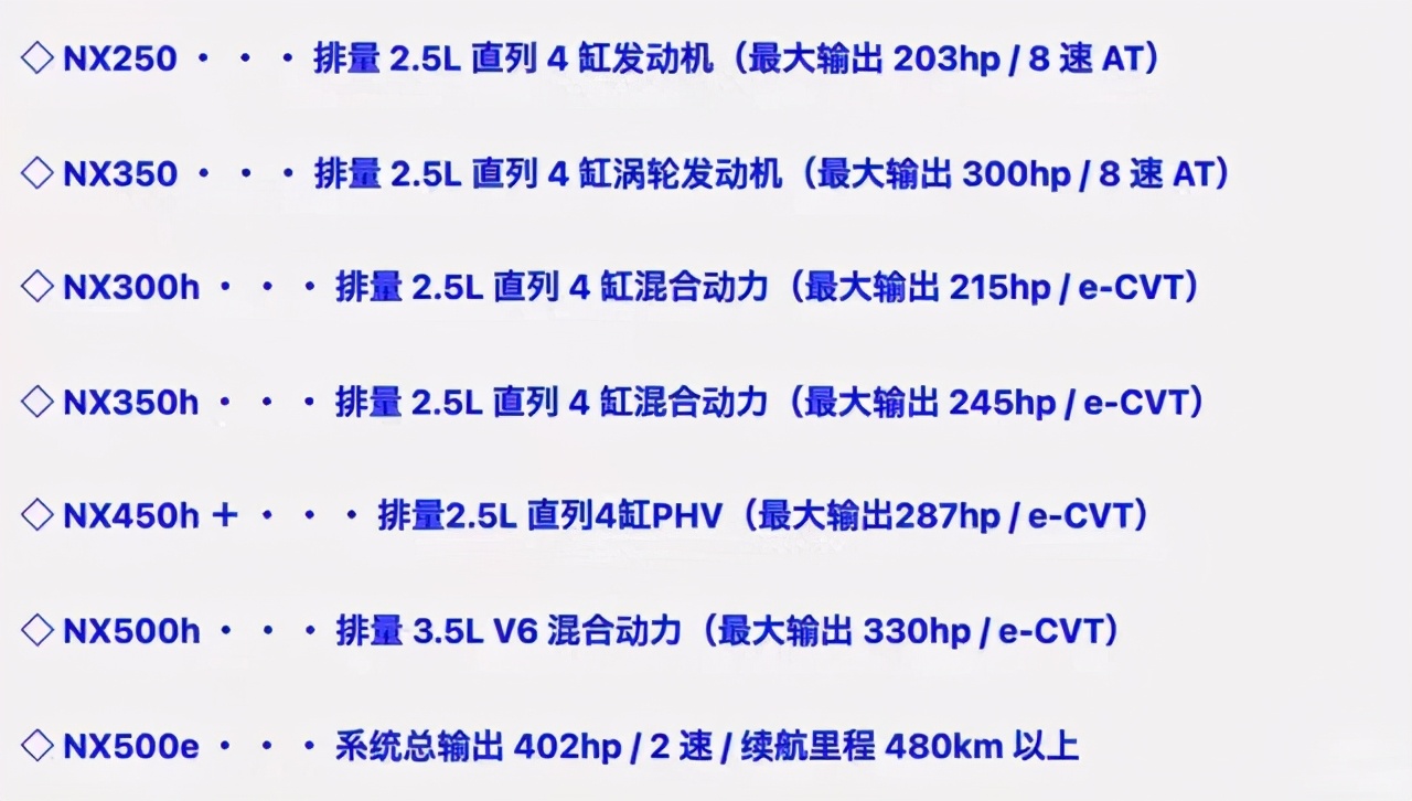 雷克萨斯NX这次改款在动力方面迎来了全面升级,老款的燃油版动力配置只有2.0L自然吸气发动机与CVT变速箱的组合,而新款燃油版则配备了2.5L自然吸气发动机和8AT变速箱,最高还有2.5T涡轮增压发动机这一强动力版本。此外还有混动和纯电版本,混动从低到高有2.5L和3.5L 6缸动力的配置,搭配e-CVT变速箱。纯电版本支持最高480KM续航,匹配2速变速箱。