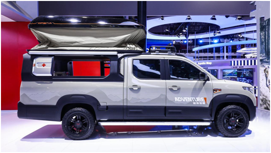 视线来到侧面,越境征途的改变同样明显,首先其加入了全地形越野轮胎,提升越野通过性的同时,也让越境征途显得更为强壮,车侧的踏板则能提升上下车的便捷性;同时越境征途在素车自带的龙门架的基础上延伸出了货箱框架,在货箱框架两侧,越境征途加入了各类实用性装备,如工具箱、医疗箱、上下车的折叠梯等;而车顶的电动折叠帐篷才是越境征途的精髓所在,车辆在户外能直接升起帐篷露营,同时其车侧还带有伸缩式遮阳棚,方便户外临时休息、做饭等活动。