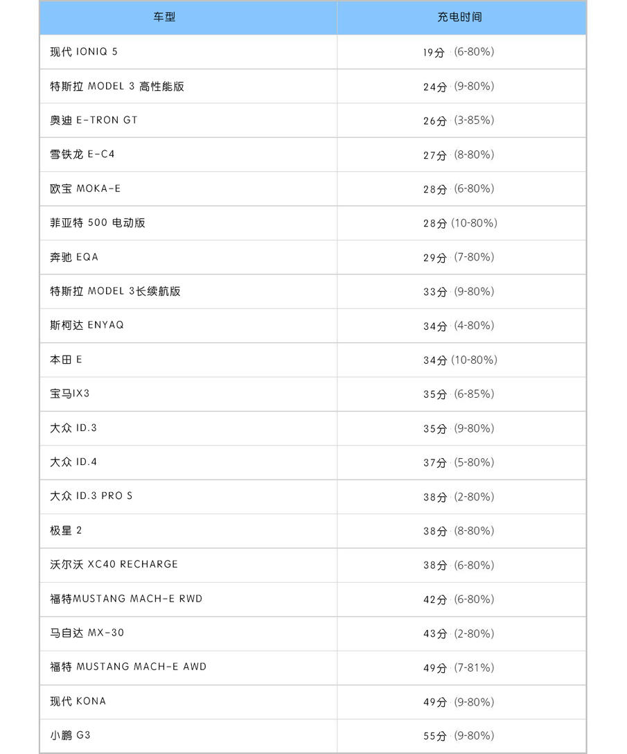 在测试车型中记录最短时间的车辆是现代 Ioniq 5。通过800V系统将电池从6%充电到80%需要19分钟。