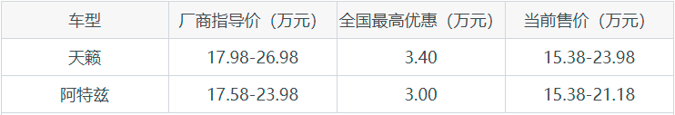 天籁和阿特兹全系优惠对比