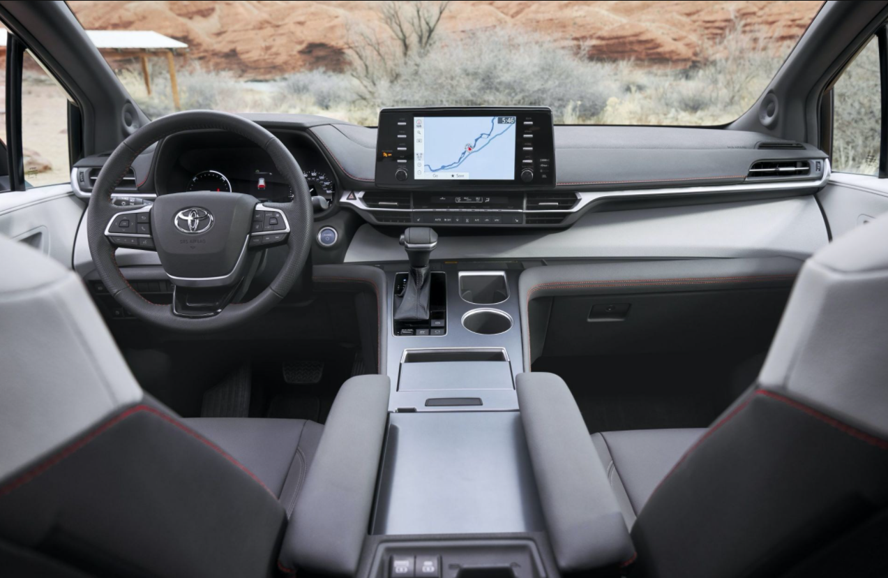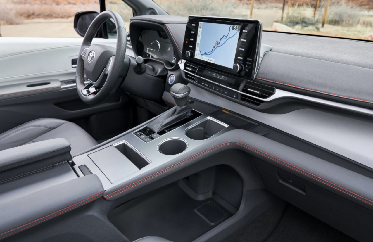 坐进车内,还是很熟悉的日系风。小编以为丰田的设计喜欢把设计重点放在外观上。在内饰方面不太愿意做过多的设计。就这辆赛那而言,内饰看起来比较素雅平淡。与流行的中控触摸屏不同,9英寸悬浮式中控显示屏在其两侧还保留了多个按键和旋钮。液晶仪表盘的尺寸为7英寸,可显示诸多行车信息。中控屏下方挂挡杆设计为悬浮式,下面留出了大量的镂空空间,目测比沃尔沃经典的悬浮中控的空间还要大一些。