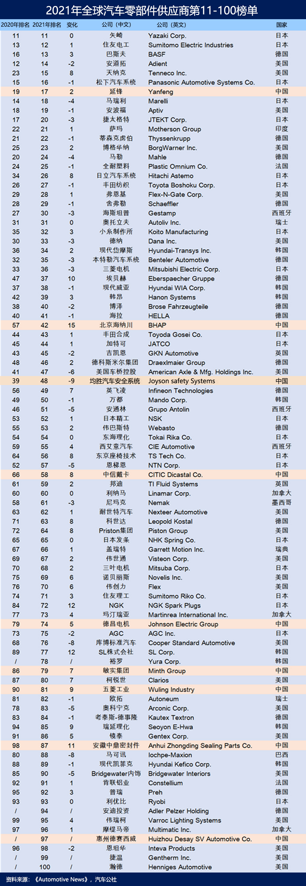 在前100之中,共有9家中国供应商上榜。其中,来自上海的延锋以第17名位列中国供应商之首。延锋主要负责汽车内外饰、座椅、电子系统等零部件,上汽大众和上汽通用是其最大的客户。最近几年,我们都说中国的汽车工业在不断进步,通过零部件供应商就能看出,咱们中国的汽车零配件产业的确在不断完善。毕竟只有配套供应商完善了,才能实现真正发达的汽车产业。