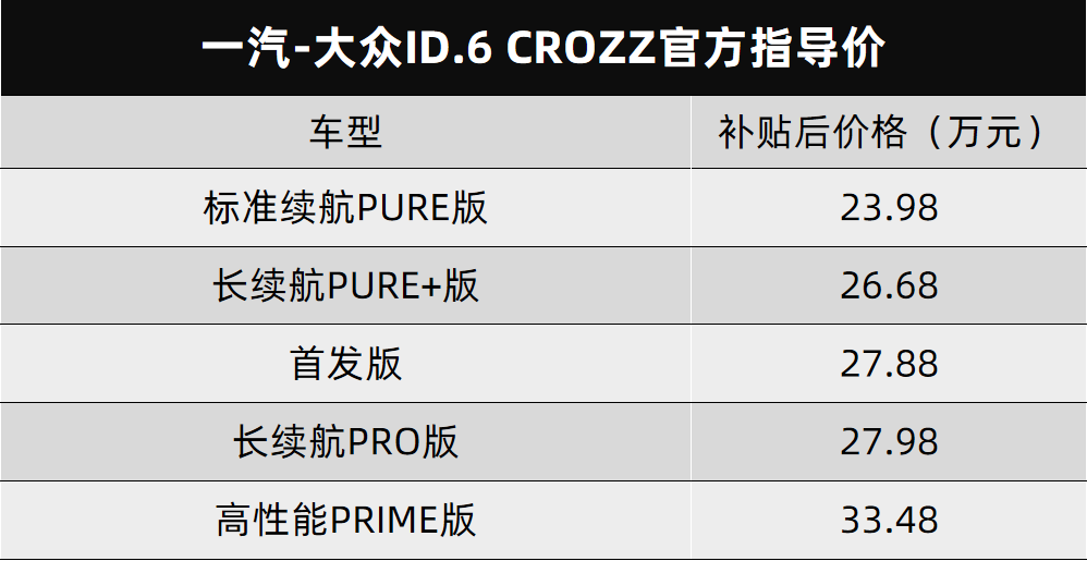 继上汽大众ID.6 X上市之后,一汽-大众ID.6 CROZZ的上市也提上日程,预计就在7月份内。而今天(7月5日)它率先公布价格,补贴后官方指导价为23.98-33.48万元,共推出5款车型,目前开始接受预订。