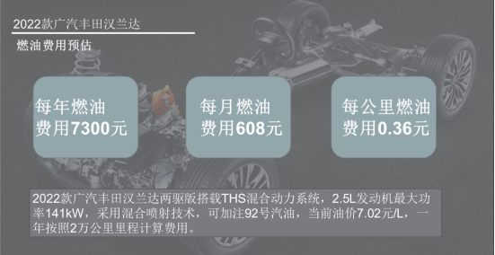 燃油费用方面,我们第四代汉兰达的两驱版本为例,该车搭载2.5L自然吸气发动机匹配THS混动系统,其中发动机最大功率141kW,NEDC油耗5.3L/100km,可加注92号汽油,当前油价7.02元/L,一年按照2万公里里程计算费用,可以算出汉兰达一年的燃油费用是7300元。
