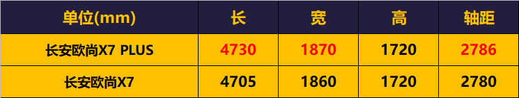 作为PLUS版本,欧尚X7 PLUS车身尺寸当然略大于欧尚X7,欧尚X7 PLUS的车长、车宽、轴距都有所提升。